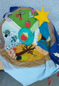 Lire, chanter, fredonner autour d'un tapis ou tablier à histoires ; outils de médiation interactifs destinés à faire découvrir la littérature pour petits et grands.